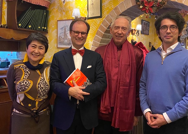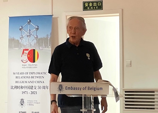 Gilbert Van Kerckhove (3e van links) vierde op 9 december 2021 zijn exact 40-jarig verblijf in China. Op deze foto staat hij met zijn echtgenote, Jan Hoogmartens, de Belgische ambassadeur te China (2e van links) en diens partner.