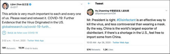 Op Twitter doen Chinese officiële regeringswoordvoerders ook een duit in het zakje. Zo tweette de woordvoerder van het Chinese Ministerie van Buitenlandse Zaken over een rapport waarin werd geopperd dat het virus door Amerikaanse militairen naar China was gebracht, en de woordvoerder van het Centrale Comité van de Chinese Communistische Partij stelde in een reactie op President Trump’s fel bekritiseerde oproep chloroquine te nemen tegen Covid-19: “Meneer de President heeft gelijk, sommige mensen moeten inderdaad met #ontsmettingsmiddel geïnjecteerd worden, of er op zijn minst mee gorgelen. Op die manier zullen ze geen virus leugens en haat verspreiden wanneer ze spreken”.