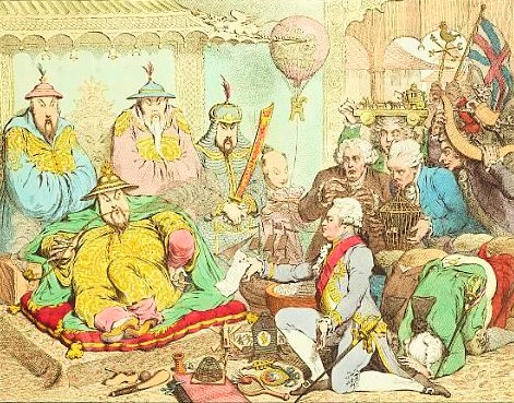 Het boek neemt ons vervolgens mee van China’s eerste contacten met het buitenland, langs belangrijke volksopstanden zoals de Taipingopstand en de Boxeropstand, naar de val van het Keizerrijk. De hoofdstukken zijn rijkelijk van afbeeldingen voorzien, waaronder onderstaande satirische tekening van Lord Macartney tijdens de eerste Britse diplomatieke missie naar China. Macartney weigerde de gebruikelijke kowtow voor keizer Qianlong te maken maar maakte tijdens zijn audiëntie een kniebuiging, zoals hij voor zijn eigen koning zou doen.