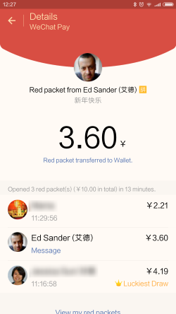 Maar de meest opmerkelijke speler blijft toch wel de Communistische Partij. Via Alipay gaf het 300.000 RMB (€40.500) aan hong bao uit aan degenen die erin slaagden de envelop te openen met wachtwoorden gebaseerd op citaten uit Xi Jinping’s nieuwjaarspeech van 31 december, welke gepubliceerd werden in het WeChat account van de partij. Voorbeelden waren ‘zolang we volharden komen onze dromen uit’ en ‘je verdient dat waar je voor gewerkt hebt’.