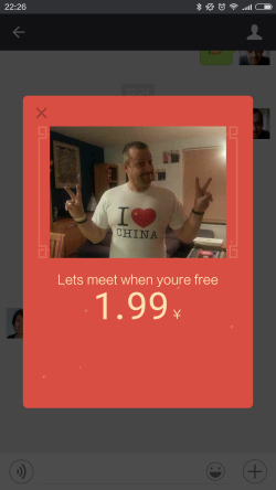 Persoonlijk ben ik ondanks het speelse karakter geen liefhebber van deze actie, met name omdat het niet meer gaat om het geven van hong bao maar om het vragen om hong bao. Het grenst daarom aan bedelgedrag. Ook mijn Chinese vrouw kreeg dit jaar van een kennis op WeChat de vraag of ze haar hong bao wilde sturen. Datingapp Momo maakte het vorig jaar zelfs mogelijk om je contacten te vragen met hong bao voor allerlei cadeaus te betalen.